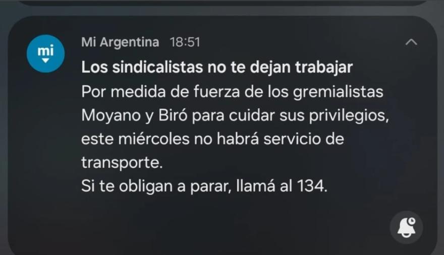 "Los sindicalistas no te dejan trabajar. Por medida de fuerza de los gremialistas Moyano y Biró para cuidar sus privilegios, este miércoles no habrá servicio de transporte. Si te obligan a parar, llamá al 134", continúa el mensaje difundido a través de Mi Argentina.