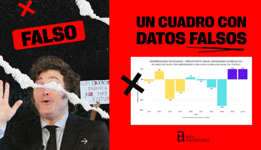 Luego del rechazo de la Cámara de Diputados de la Nación al veto a la ley de financiamiento universitario, circularon en X mensajes Fake que aseguraban que Javier Milei era “el presidente que más plata en términos reales le dio a las universidades públicas y Sergio Massa fue el que más plata les quitó”. El Presidente compartió esta desinformación en dos oportunidades.